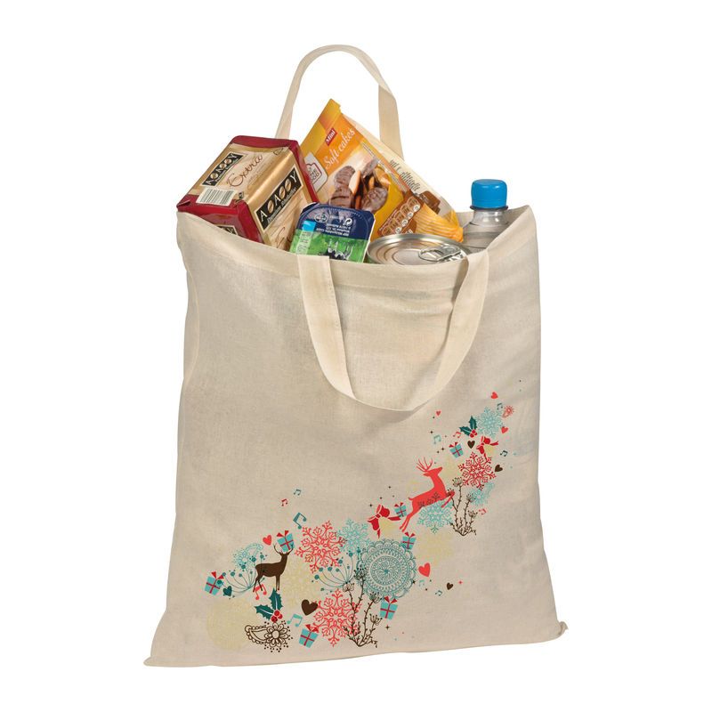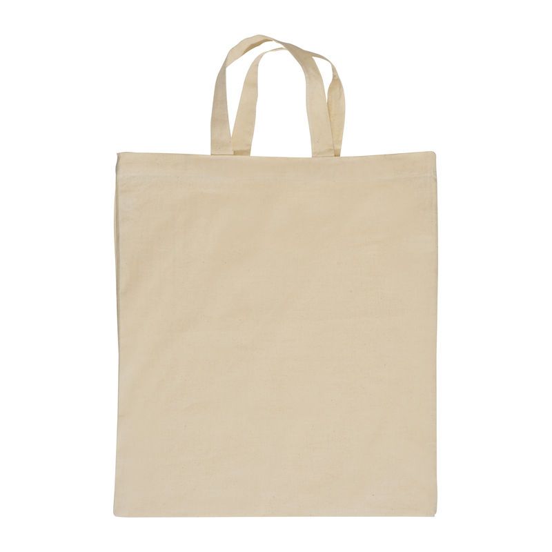 Οικολογική τσάντα αγοράς από 100% βαμβάκι, με κοντά χερούλια σε εκρού χρώμα.