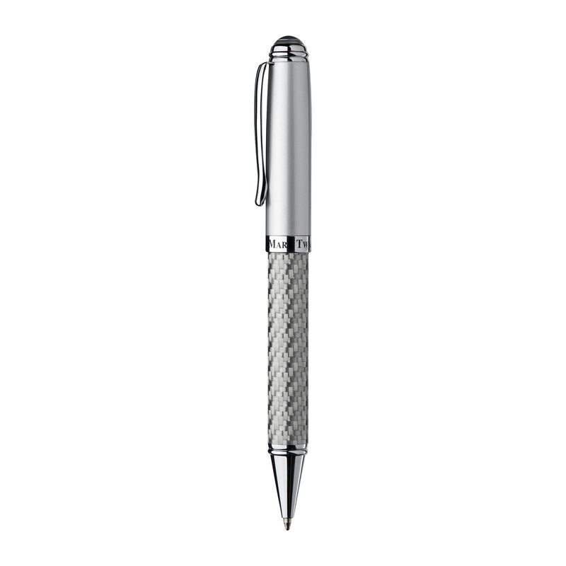 Το μεταλλικό στυλό της Mark Twain με ασημί σχέδιο carbon το οποίο ανοίγει περιστροφικά, αποτελεί ένα κομψό εργαλείο γραφής. Διαθέτει μπλε μελάνι και μεγάλης χωρητικότητας ανταλλακτικό. Συνοδεύεται από θήκη στα ίδια χρώματα με το στυλό, δημιουργώντας ένα στυλάτο και εκλεπτυσμένο δώρο.