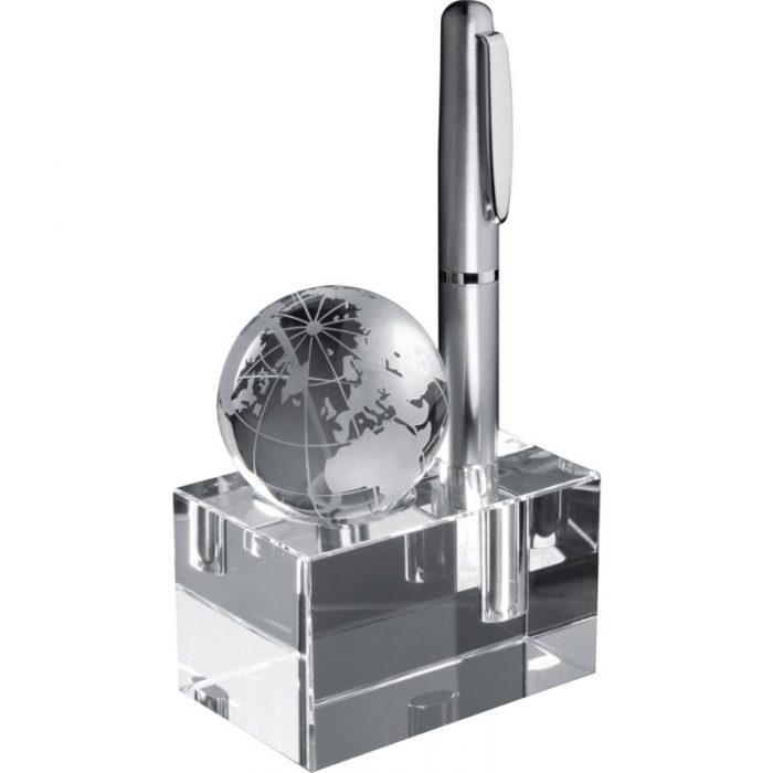Γυάλινο διακοσμητικό γραφείου με υδρόγειο σφαίρα και θήκη για στυλό.