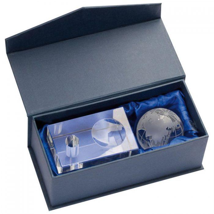 Γυάλινο διακοσμητικό γραφείου το οποίο περιλαμβάνει αφαιρούμενη υδρόγειο σφαίρα και θήκη για στυλό σε ένα ελκυστικό πρες παπιέ. Η διαφήμιση σας μπορεί να χαραχθεί πάνω στο γυαλί με εξαίρετα αποτελέσματα.