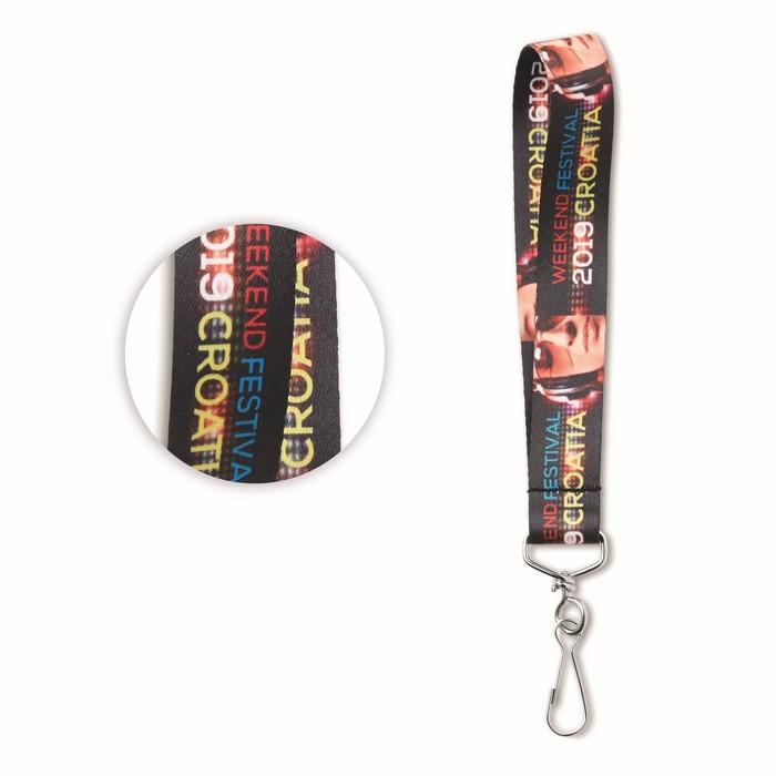 Κοντός ιμάντας από φίνο πολυέστερ (κορδέλα) με μεταλλικό γαντζάκι στην άκρη του. Το λογότυπο σας τυπώνεται με 4χρωμη εκτύπωση sublimation (εξάχνωση) και στις δύο όψεις.